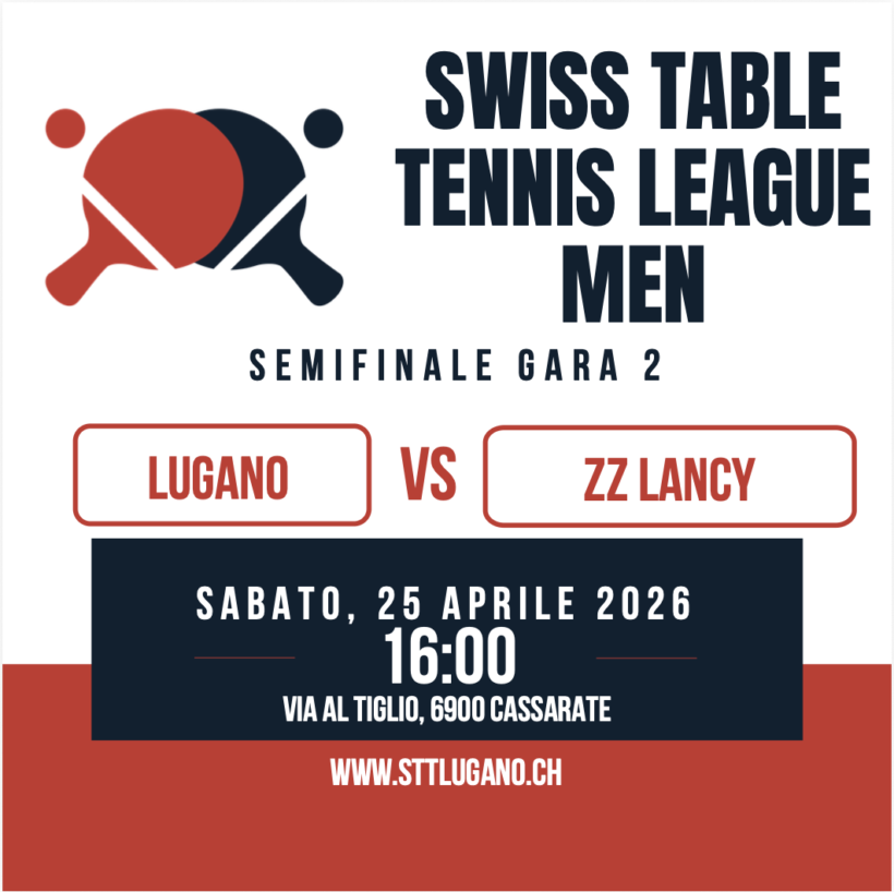 Prendono il via i playoff della Swiss Table Tennis League Men e la STT Lugano è pronta a scendere in campo per una semifinale molto attesa contro lo ZZ Lancy. Una sfida che si preannuncia intensa e spettacolare, rievocando il confronto dello scorso anno, quando furono i ginevrini ad avere la meglio.La serie si aprirà venerdì 24 aprile a Lancy con gara-1, per poi spostarsi a Lugano dove si disputeranno gara-2 sabato 25 aprile, alle ore 16:00 e l’eventuale gara-3 domenica 26 aprile alle ore 14:00. Un programma serrato che metterà alla prova concentrazione, qualità tecnica e resistenza delle due squadre. La STT Lugano arriva a questo appuntamento forte di un’ottima stagione regolare, conclusa al secondo posto. Un risultato che conferma la solidità e la continuità del nostro club, ormai stabilmente ai vertici del tennistavolo svizzero e presenza fissa nei playoff da diversi anni.Le premesse sono quelle di una serie equilibrata e di alto livello, tra due formazioni ambiziose e determinate a conquistare un posto in finale. Nell’altra semifinale si affronteranno il Carouge e gli Young Stars ZH, completando così un quadro playoff di grande spessore.